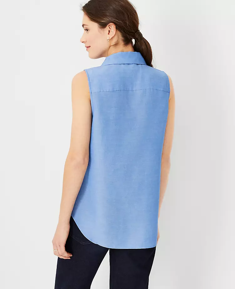 With a slim fit and a bit of drape, count on this one every time you go to your closet. Point collar. Sleeveless. Button front placket. Back yoke. Shirttail hem.