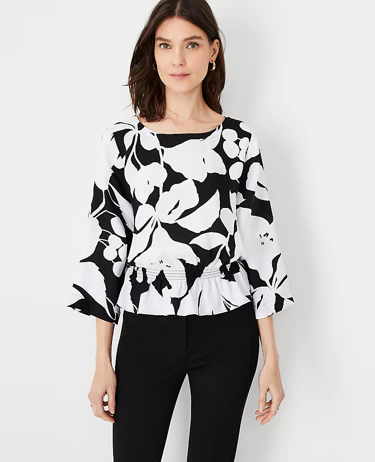 Cinched at the waist for a flattering fit, our wide sleeve top is flourished with artful florals. Boatneck. 3/4 sleeves. Smocked waist.