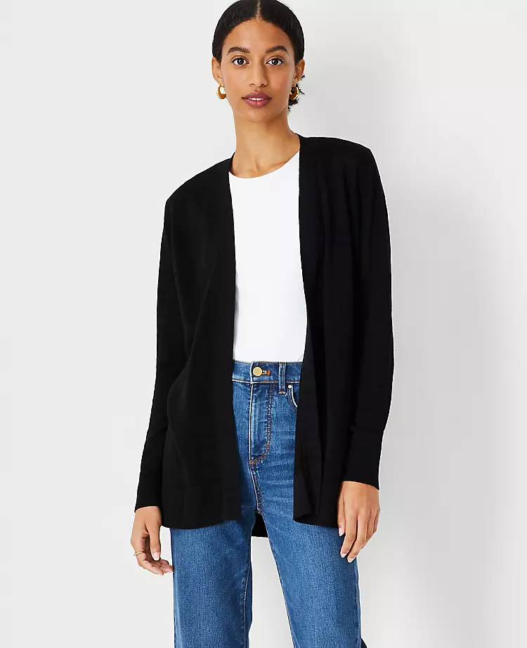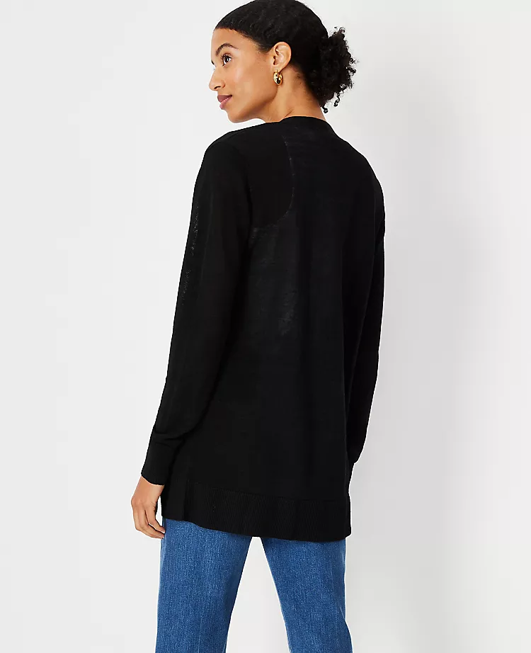 Easy and effortless, there’s nothing more layer-friendly than our linen blend open cardigan. Open front. Long sleeves. Ribbed cuffs and hem.