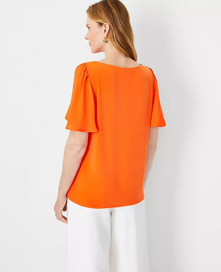 Topped with flowy angel sleeves, this mixed media top channels an extra pretty ease that’s perfect for the season. Boatneck. Short sleeves with shirred sleeve caps.