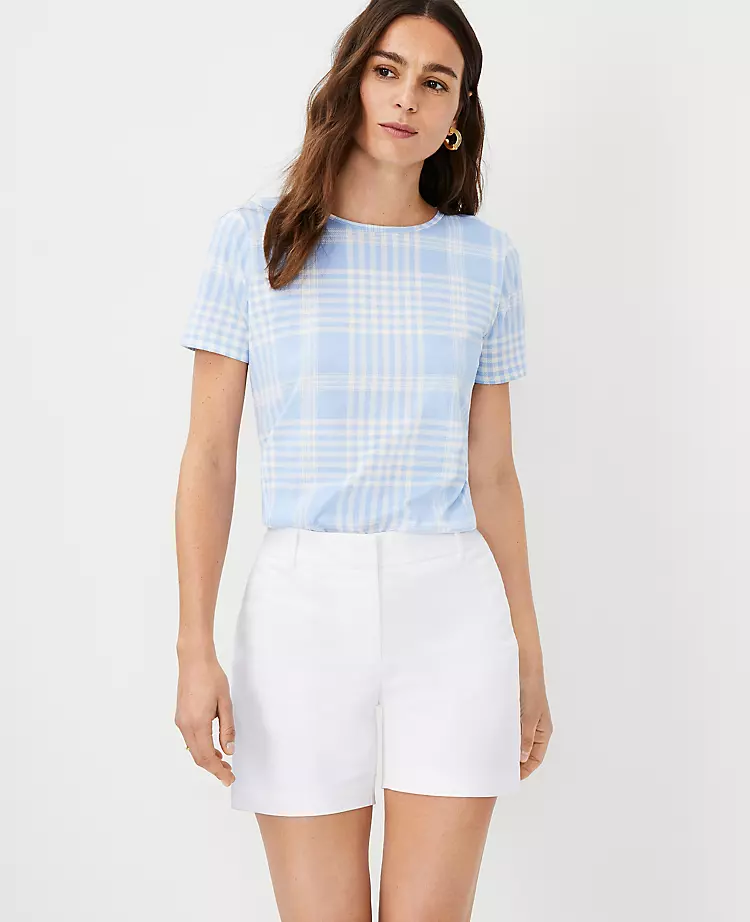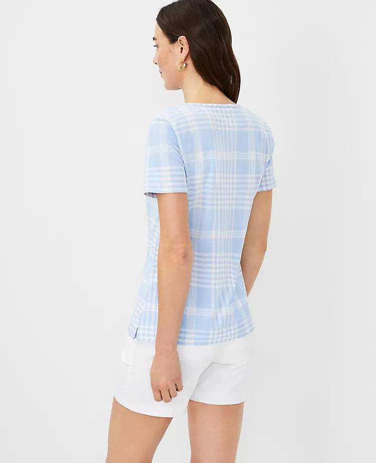 On or off the grid, our pure cotton plaid top checks all the boxes. Crew neck. Short sleeves.