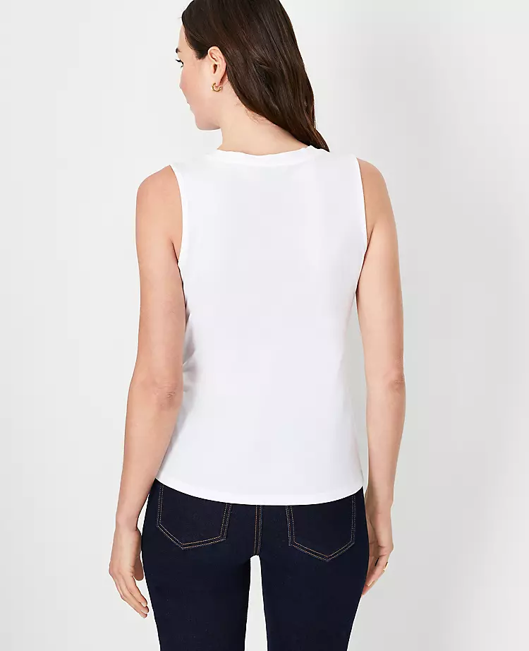 We’ve added an asymmetrical drape to our cotton crew neck shell to cinch an extra flattering fit. Crew neck. Sleeveless.