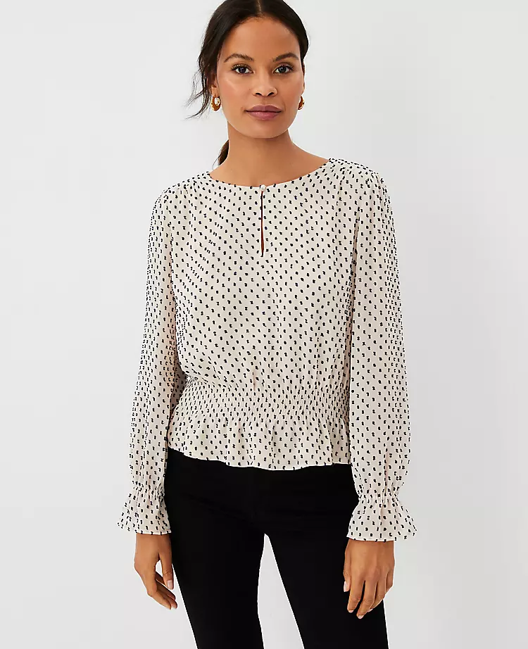 Smocked at the waist for extra flattering fit, our slit front top is a cinch to style. Crew neck with front slit and button closure. Long sleeves with shirred sleeve caps and elasticized cuffs. Shirred forward shoulder seams and back yoke. Smocked waist. Lined body.