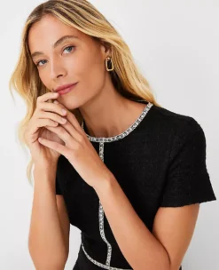 Refined contrast trim adds an especially polished touch to our textured tweed flounce dress. Crew neck. Short sleeves. Hidden back zipper with hook-and-eye closure. Lined body.