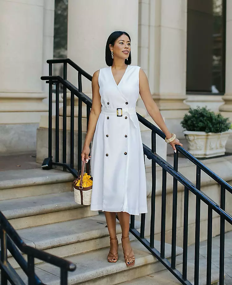 For a feminine take on classic suiting, our double-breasted dress is finished with a touch of flare. V-neck. Sleeveless. Double breasted button front. Self tie buckle belt. Hidden back zipper with hook-and-eye closure. Lined.