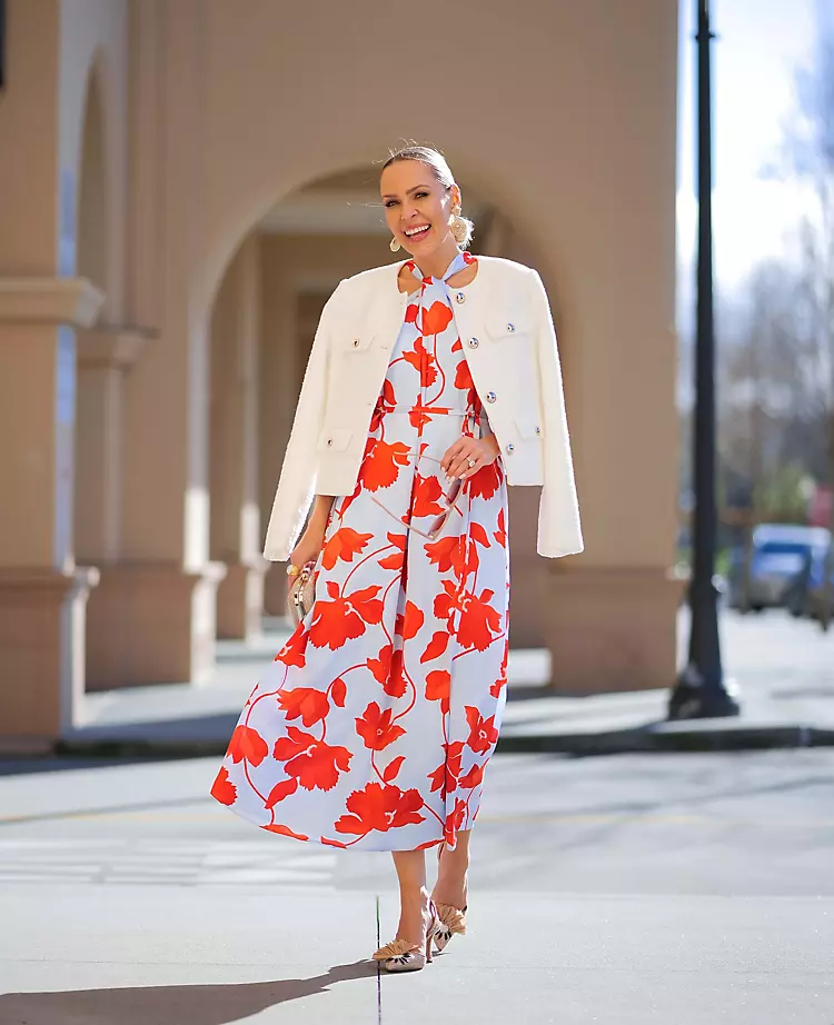 From the shoulder baring design to the covetable color, our floral halter maxi dress is a style-defining look. Halter neck with front slit. Self tie belt. Back slit with button closure. Lined.