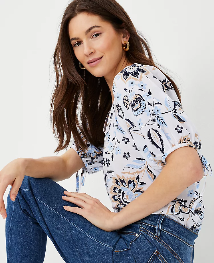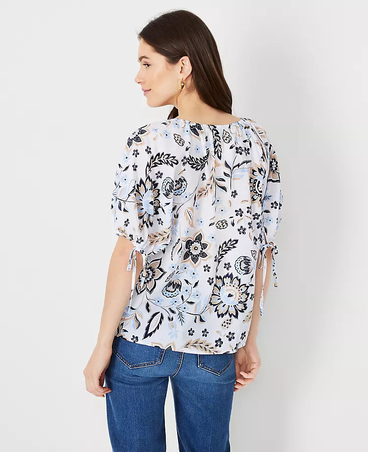 A sleek V-neck paired with puff tie sleeves equals feminine perfection – with a modern twist. V-neck. Short raglan sleeves with ties.