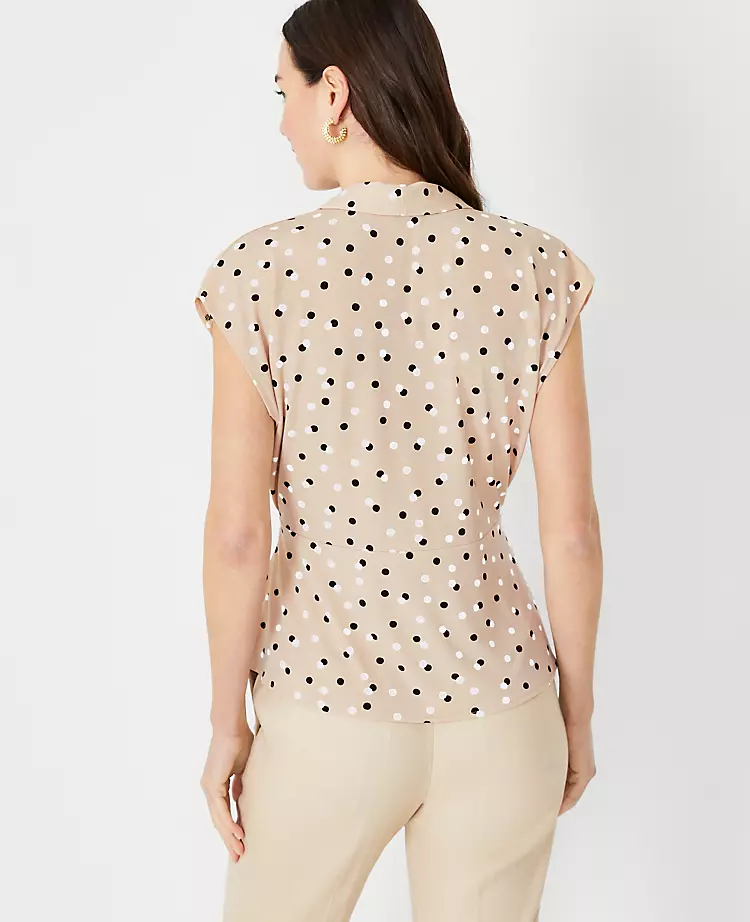 With a refined shawl collar, our mixed media peplum top is a polished day-to-night separate. Shawl collar. Cap sleeves. Peplum hem.