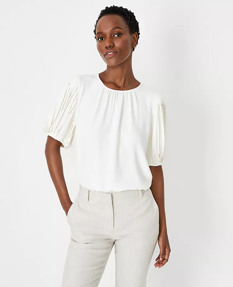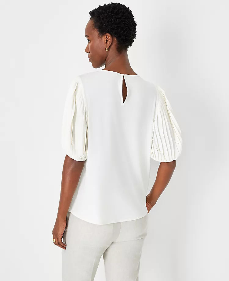 Our mixed media top features finely pleated sleeves, for a fresh fold. Shirred crew neck. Elbow sleeves with elasticized cuffs. Back slit with hook-and-eye closure. Woven front and sleeves. Knit back.