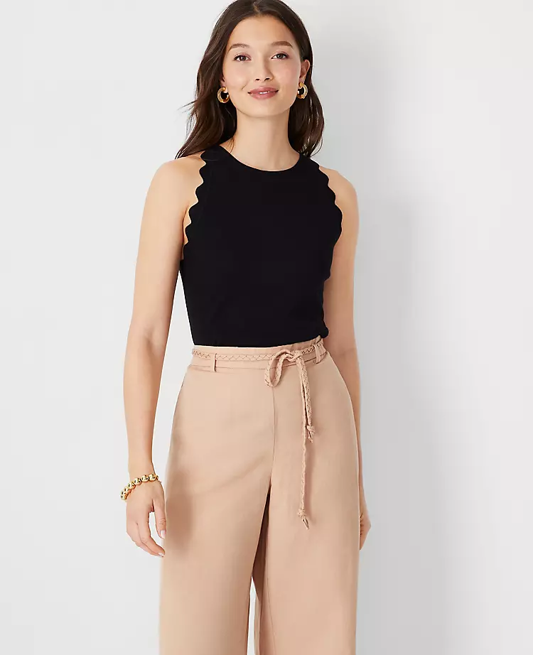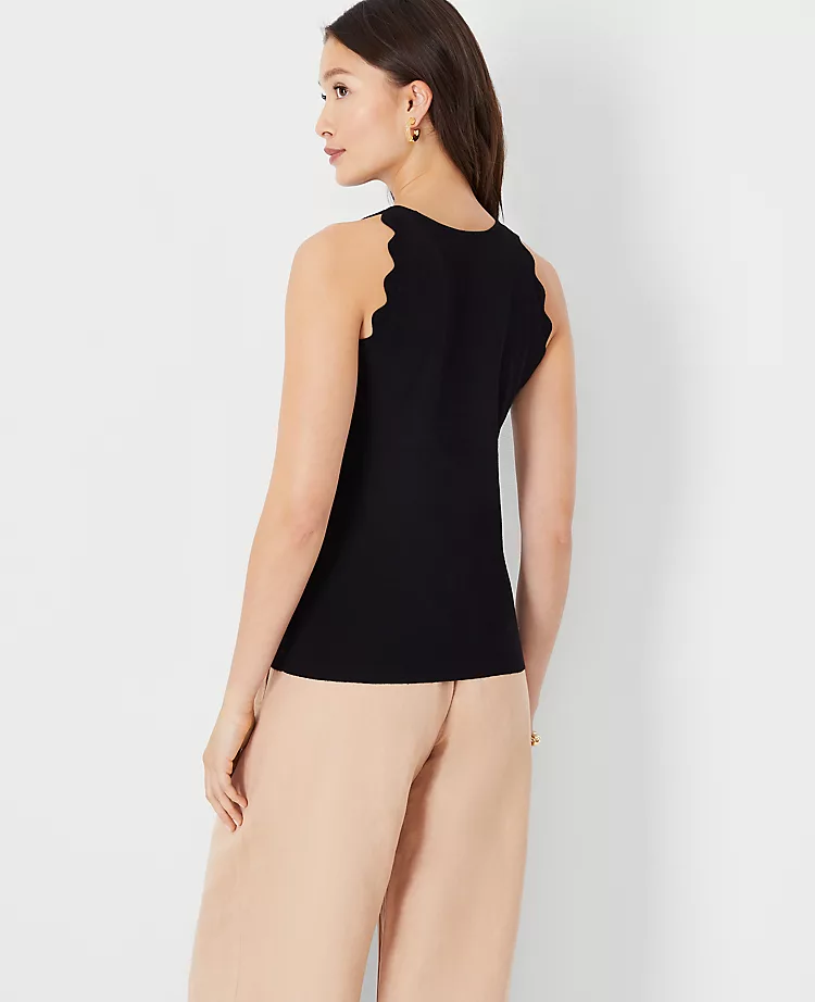Scalloped trim gives our halter sweater shell an extra pretty edge. Halter neck. Sleeveless.