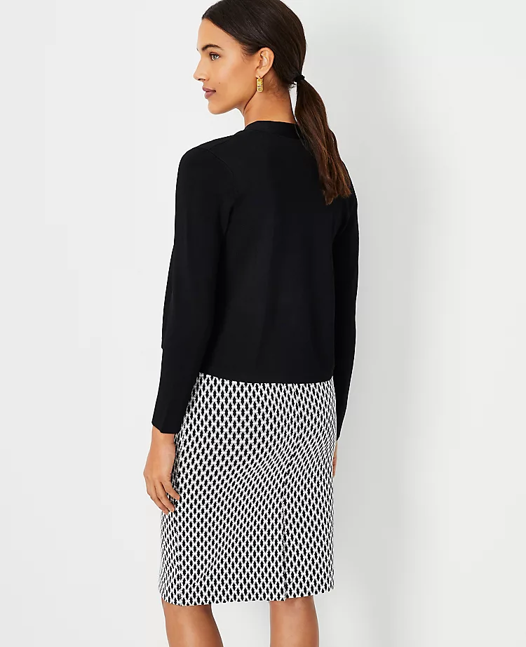 With a luxuriously silky feel and subtle shine, there’s nothing more layer-friendly than our cropped open cardigan. Open front. Long sleeves. Ribbed cuffs and hem.