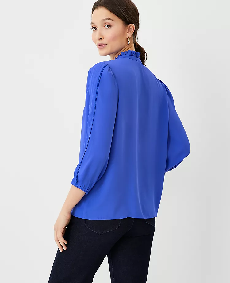 Pintucks add crispness and texture to this mixed media ruffle neck top. Ruffle crew neck. Long sleeves with shirred sleeve caps and elasticized cuffs. Button front. Pintucked front and sleeves. Woven front and sleeves. Knit back.