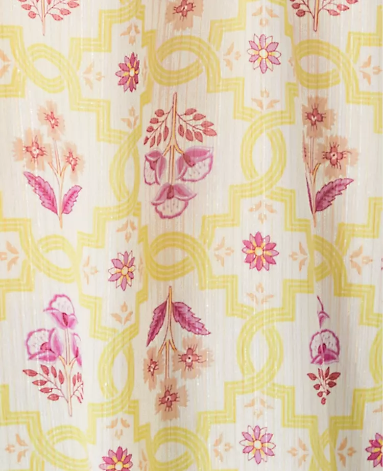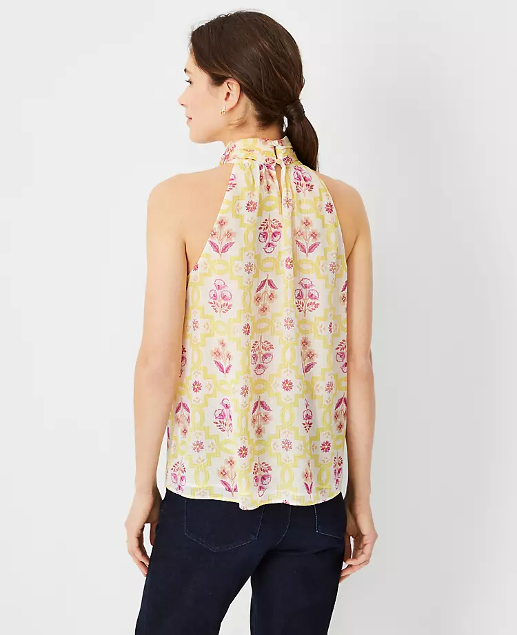 Lined up with shimmery stripes and tied as a bow at the front, back or side – or even worn loose in front – this smartly cut halter top pulls it all together in endless ways. Shirred stand collar with ties. Back slit with button closure. Lined.