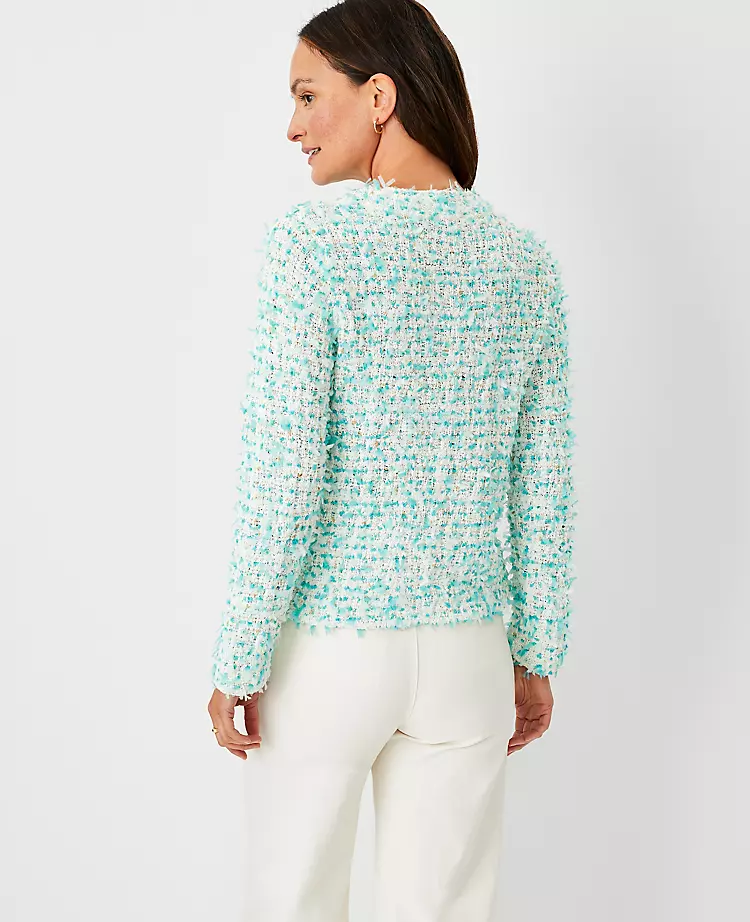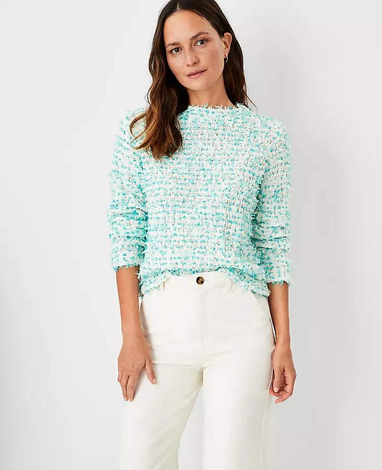 In a subtly shimmery and finely textured weave, this tweedy sweater is a need-to-own wardrobe staple. Funnel neck. Long sleeves.