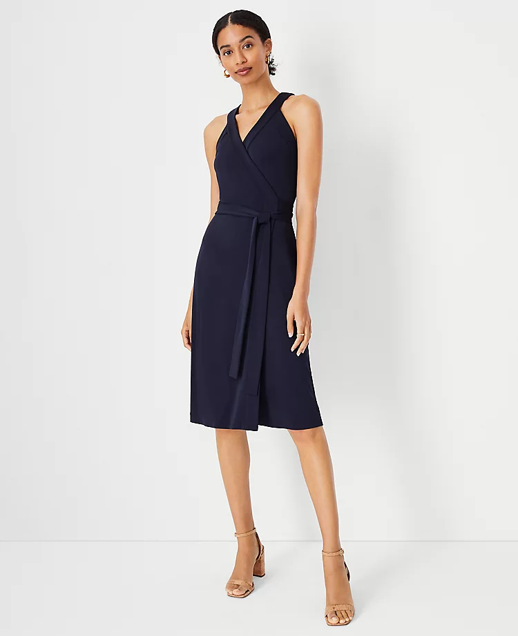 Our timeless wrap dress gets a warm weather refresh, with a belted waist and sleeveless silhouette. Crossover V-neck. Sleeveless. Self tie waist.
