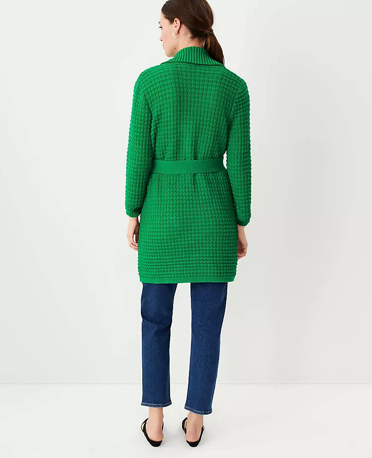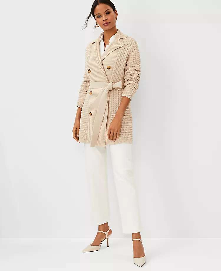 In a textured geo stitch, our double breasted coatigan merges the softness of a knit with the structure of a coat. Notched lapel. Long sleeves. Double breasted button front. Self tie belt.