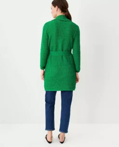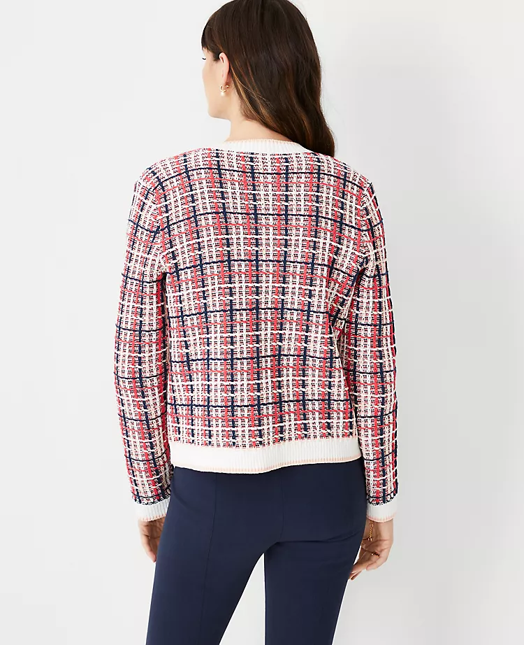 Texturally refined, this tweedy sweater jacket is polished with shiny button detail. Crew neck. Long sleeves. Button front. Flap button pockets.