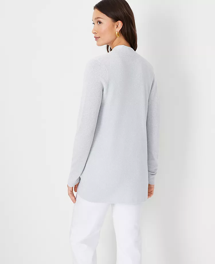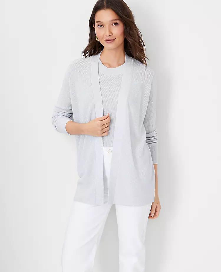 An ideal lightweight layer, our shimmer-infused open cardigan highlights your wardrobe with a hint of sheen. Open front. Long sleeves.