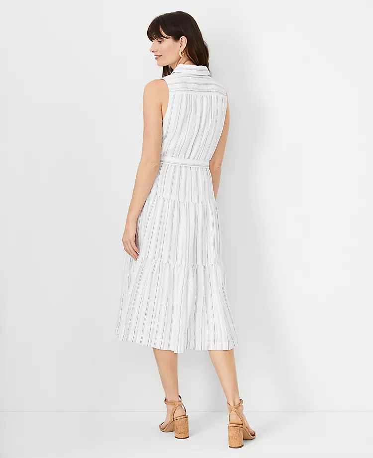 Our tiered ruffle skirt dress takes you to a whole new level of pretty. Point collar. Sleeveless. Button front placket. Front and back yoke with shirring below. Self tie buckle belt. Shirred ruffle skirt. Lined.